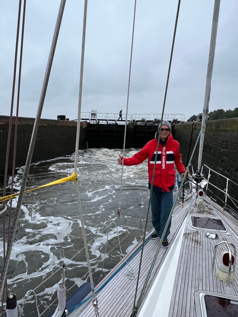 Richard hadde noe han hadde lyst til å snakke om. Han kaller oss opp på VHF’en og sier han åpner slusene og Capraia tusler inn helt alene. Ingen andre båter skal være med. Fendere med planke på utsiden er anbefalt for å slippe å få fendere med grønske på. Pyntetrekkene på fenderne er borte. Richard er en hyggelig fyr han. Vi prater litt om løst og fast og sprekken i portene til slusen åpner seg og vann fosser inn og løfter oss opp ca 3,5 meter.