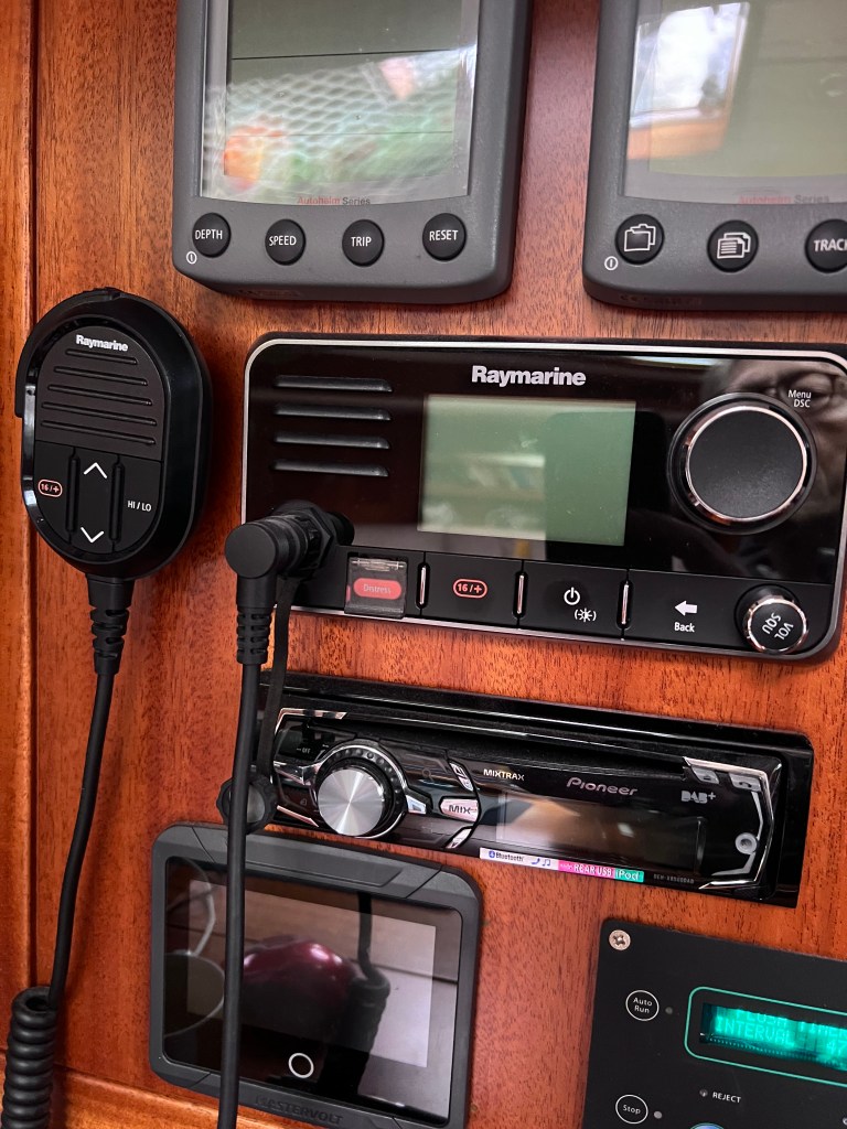 Men, la oss starte med begynnelsen. Vi finner åpningen til kanalen og den første slusen. Mye mindre enn vi hadde trodd. Vi har slått på kanal 74 på VHF. Kanalen vi skal leve med noen dager. For landkrabber, VHF er en Very High Frequency Radio dings som henger ved arbeidsstasjonen i Capraia. Alle litt store båter har VHF og vi ringer hverandre (kaller opp) om det er noe vi har lyst til å snakke om.