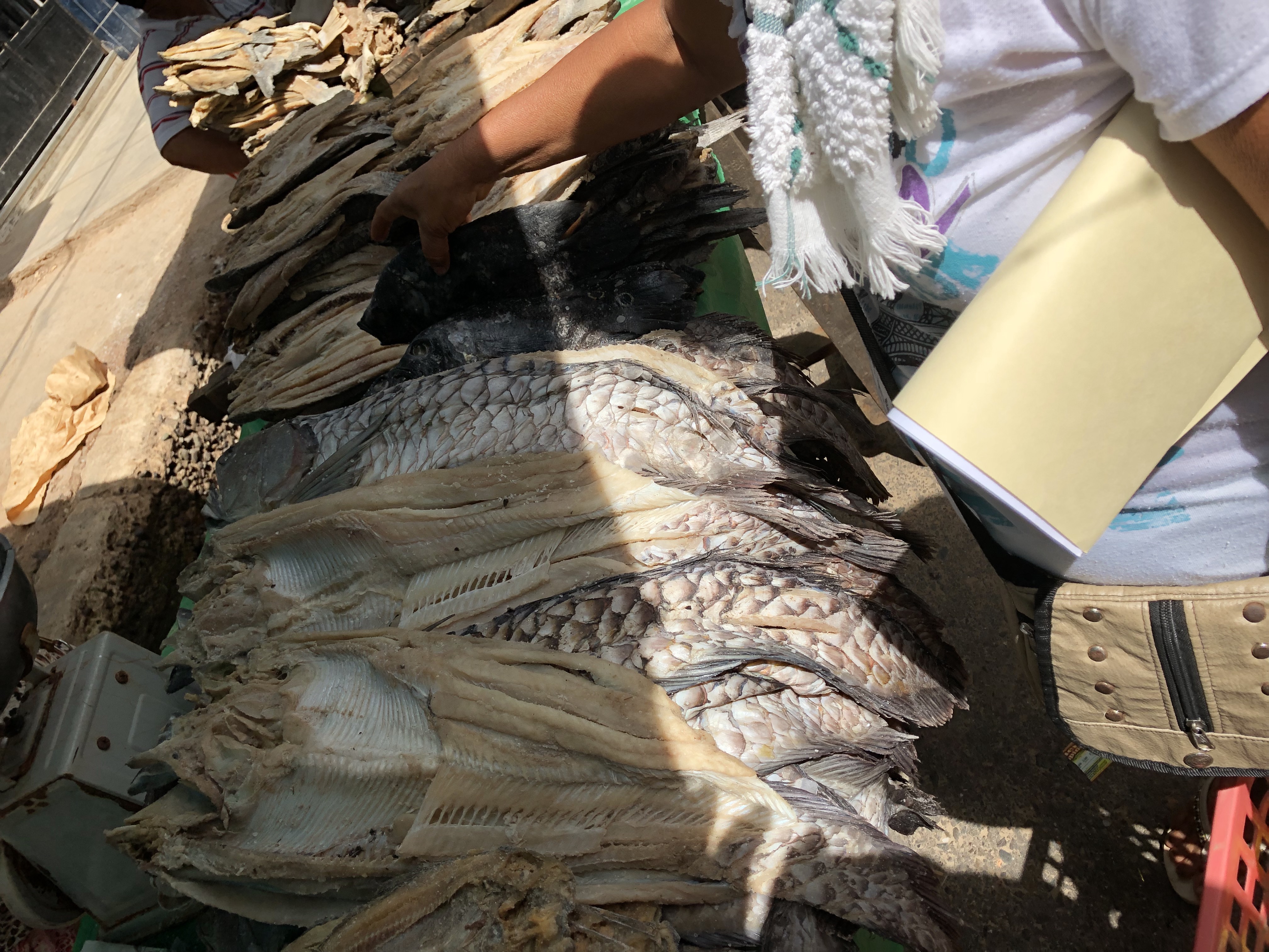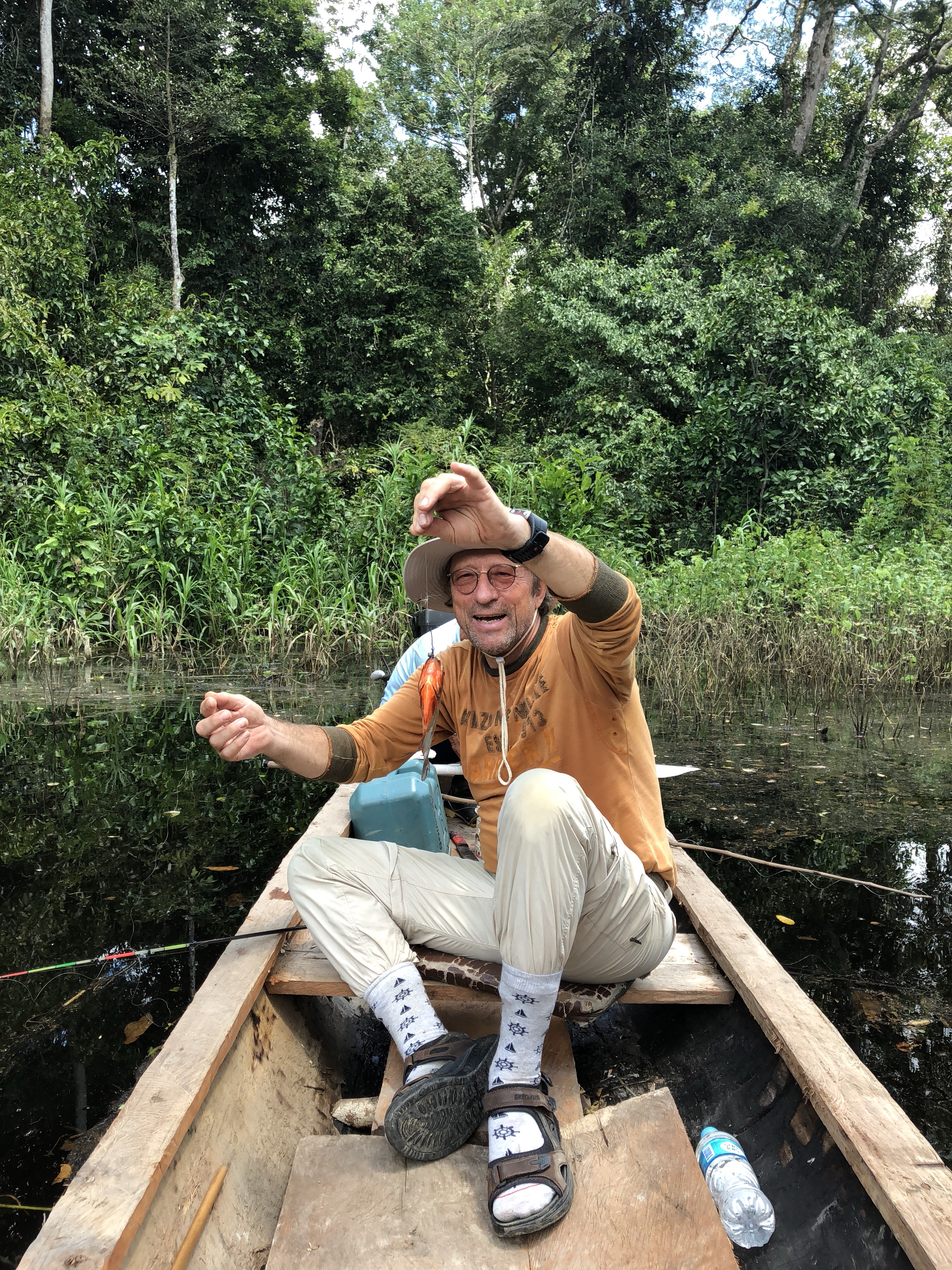 Jeg satte turistrekord med mine tre. Fisket er enkelt; ta et barberblad og skjær et lite snitt i tåa til det blør litt, dypp den så i vannet og hold et godt øye med den. Når pirajan angriper, dra foten fort opp i båten og fisken hopper etter.