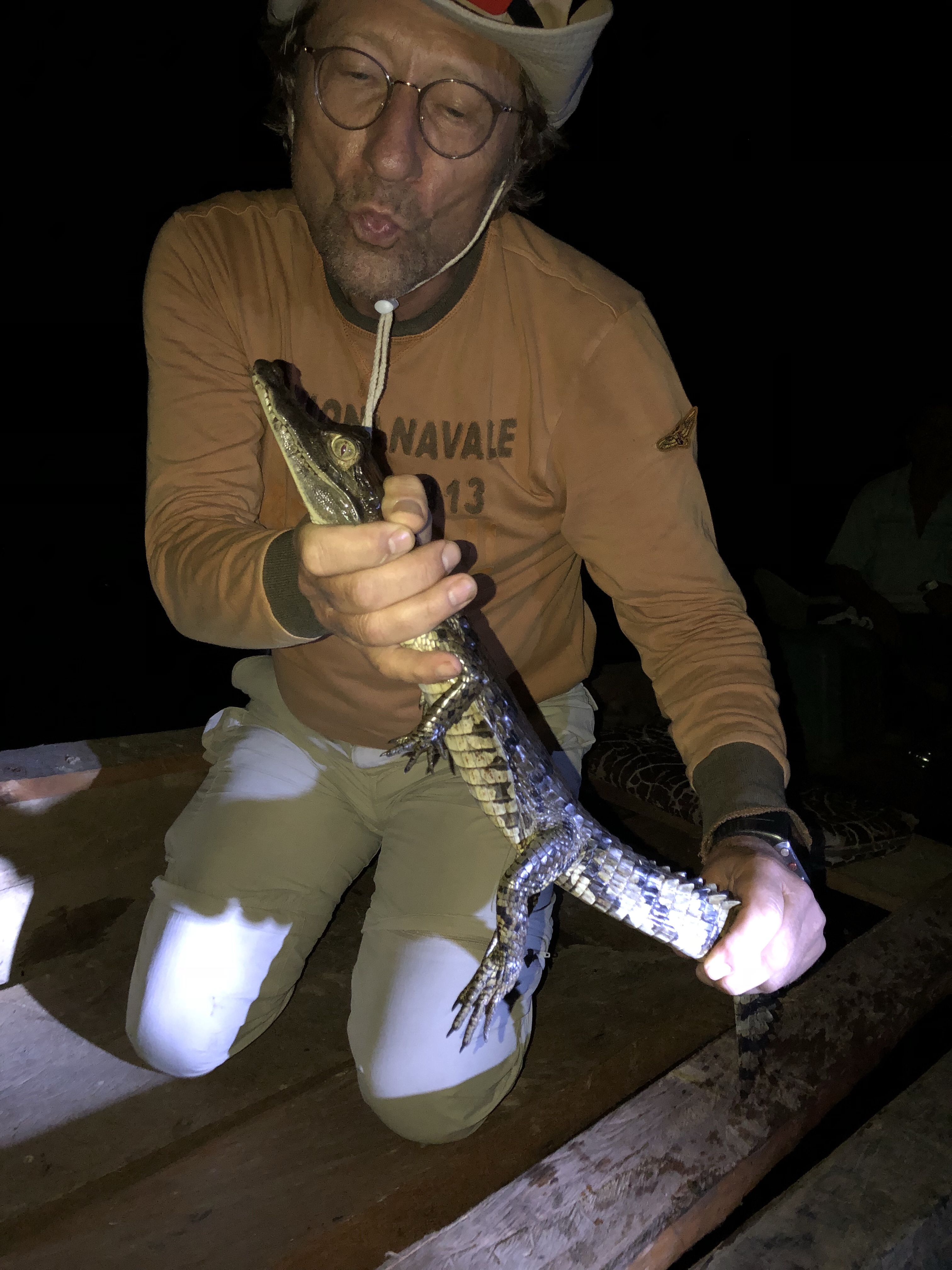 Akkurat passe store til å leke litt med etter at guidene har stoppet kjeften på den. Den blir sluppet ut igjen etter måling og bilder. Vi skal nå ha hvite som er bedre mat. De er ikke like store men ødelegger fort benet ditt om du frister den litt. Lurer på om reiseforsikringen dekker krokodille bitt? Jegerne er igang og vi hører mye plasking og bråk. 1 jeger står i den bitre lille kanoen med spyd mens den andre padler inn i sivet til de røde øynene. Når spydet sitter er det fram med manchete. 4 passende hvite er på plass i kajakken, en klarer å rømme uten å ta med seg en legg, men vi har nok mat så det blir bra.