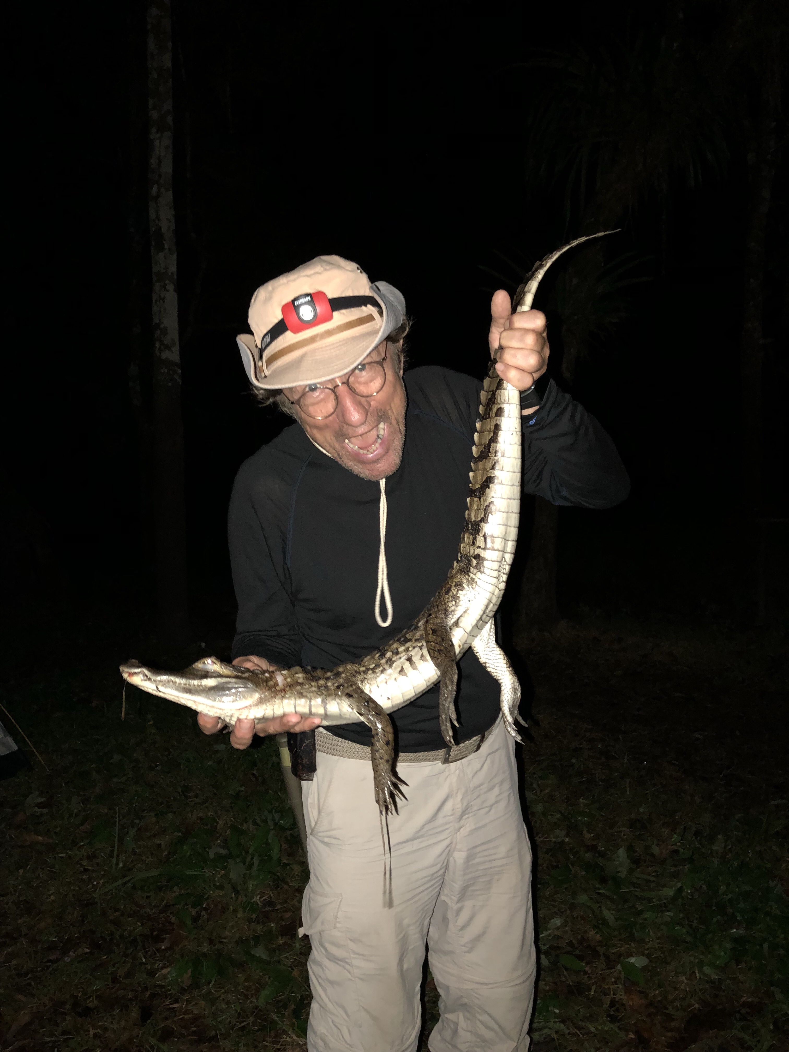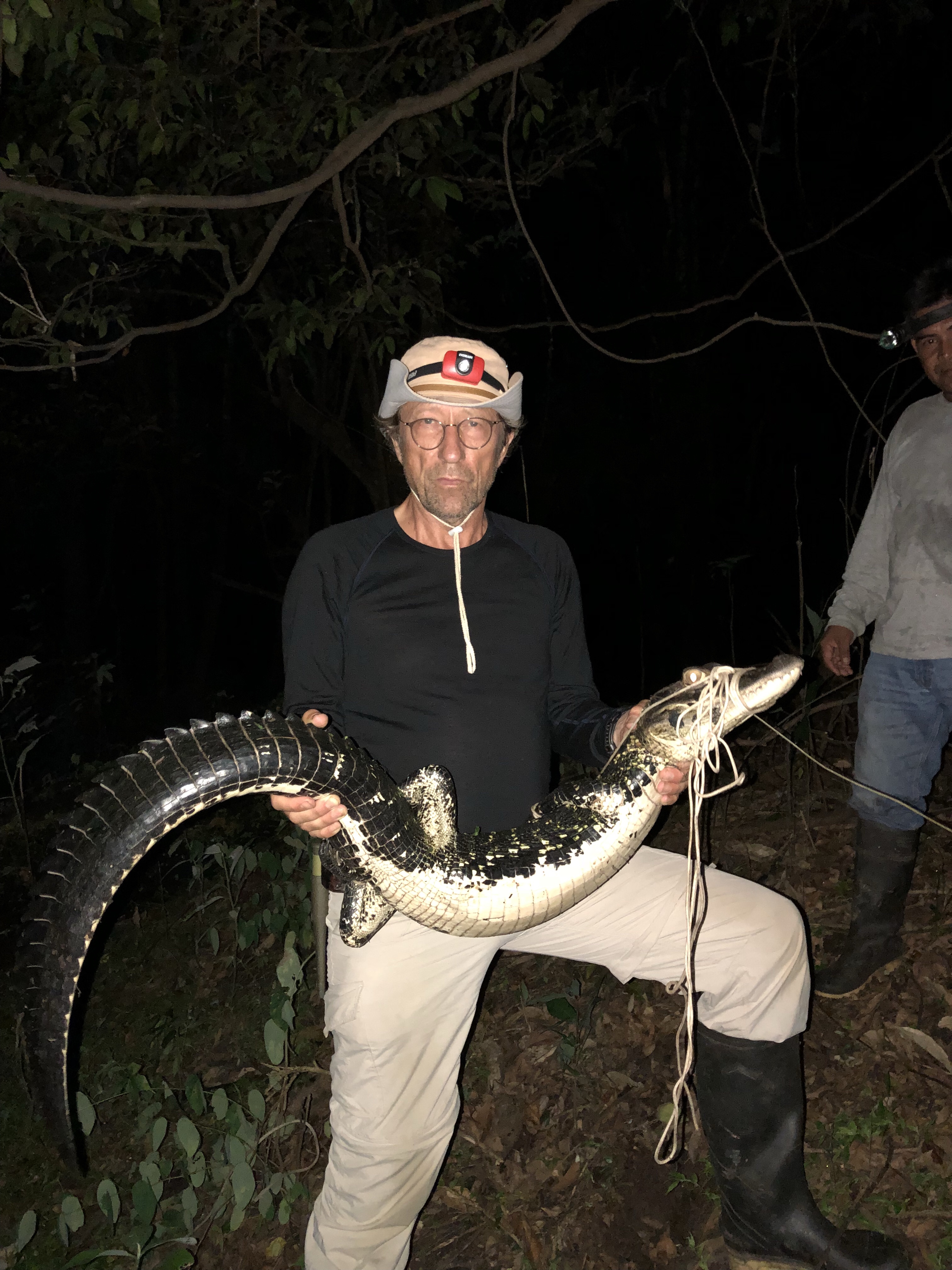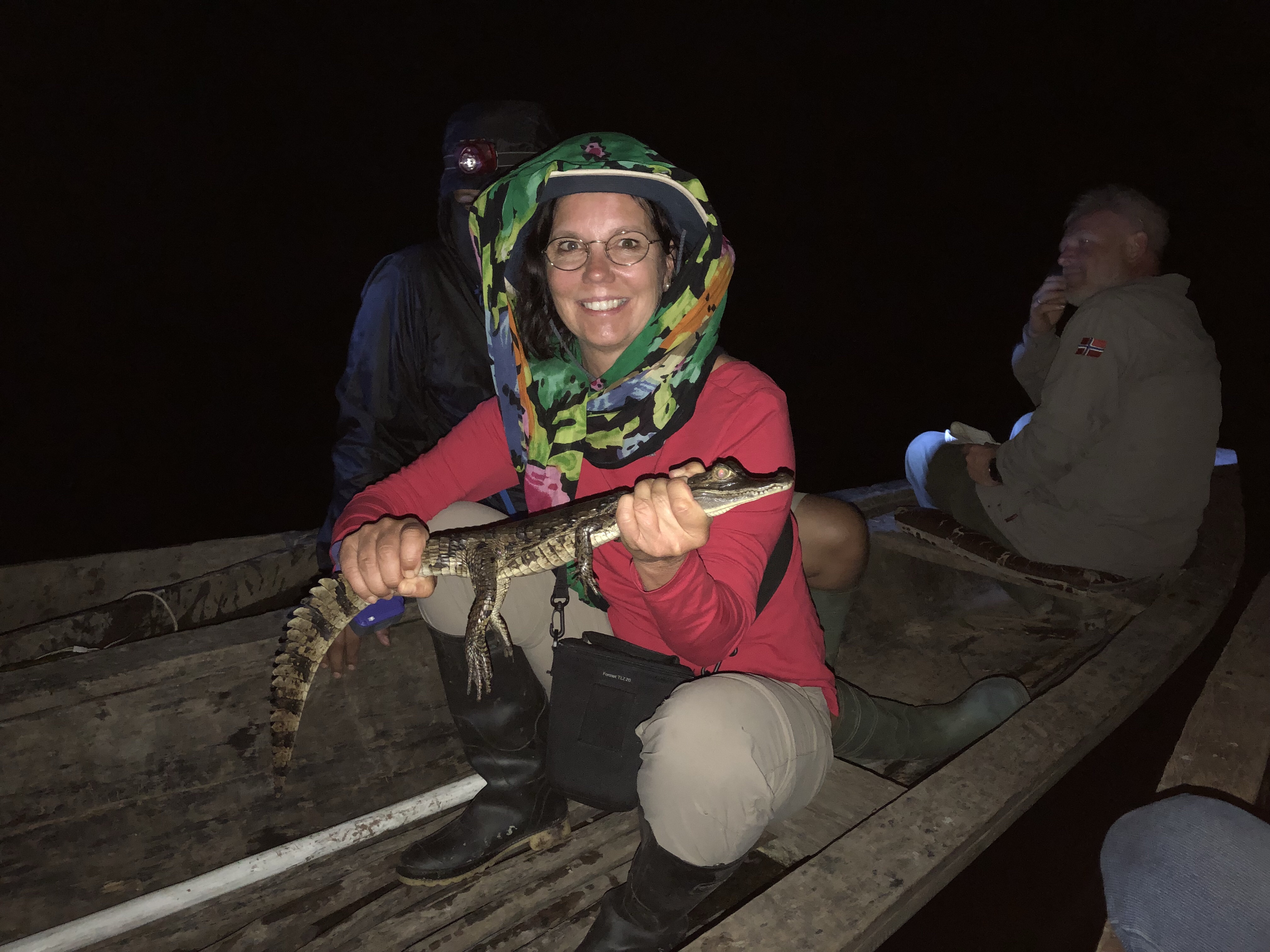 Og så ble det krokodille jakt. Det er faktisk spennende. Vi driver helt stille nedover elven i våre smale elvekajakker som er uthulede trestammer og det i stummende mørke. Det er helt trolsk. Vi lyser inn langs elvebredden med lykter til vi ser noen lysende øyne og så begynner jakten. Størrelsen bestemmes av avstanden mellom øynene som lyser. Greit å ikke bomme og prøve seg på en over 4 meter. De liker visstnok ikke å bli fanget. Men det er jo ikke så rart. Jeg har ikke lyst til å bli fanget jeg heller. Den første vi fanger er en mellomstor sort.