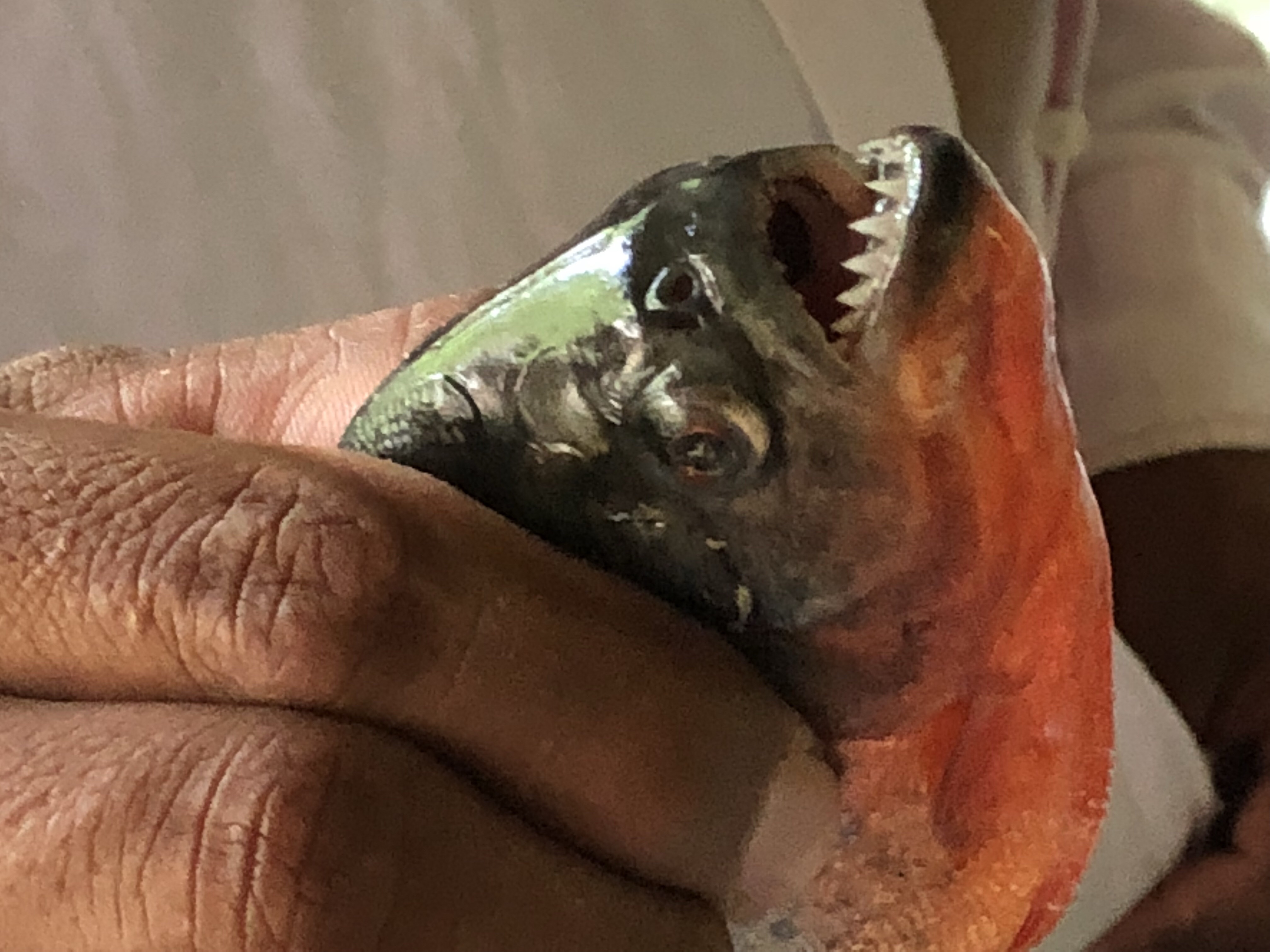 Neida, bare tull, fisker med agn. Det er en helt spesiell teknikk for å få de rakkerne opp i kanoen. Man må være veldig følsom i fingertuppen og veldig rask. Når den biter så dra til og få den opp av vannet så fort som mulig. Den slipper ofte kroken fort og spreller i kanoen. Da er det greit å passe tåa og samtidig ikke bevege seg så mye at kanoen går rundt og falle i vannet med alle Pirajaene. Jeg tror fort man da glemmer alle tanker om overvekt for å si det sånn. Om den sitter fast på kroken, er den nesten verre. Piraiaer forstår dårlig norsk. “Slipp kroken pent og legg deg rolig i bøtta da din lille jævel”, men lydige er de rakkerne heller ikke. Historien om å bruke egen tå som lokkemat er ikke langt unna sannheten når det gjelder fisket til noen indianerstammer. De fester små skinnbiter til hælen sin (som har en noe tykkere hud enn mine vakre og sarte føtter som aldri har sett dagens lys).